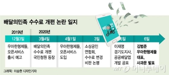 인수 합병 당시 가격 정책에 변동이 없을 것이라는 말과 달리, 배민은 2020년 4월 광고비 시스템에서 수수료 시스템으로 돌아왔다. 원래 배민은 ‘울트라콜’이라는 광고비에서 수익을 얻는 정액제 시스템을 따르고 있었다. 하지만, 울트라콜을 대량으로 구매하여 노출을 독점하는 점주들이 생기자, 배민은 울트라콜을 3회로 제한하되, 줄어든 수익을 중개 수수료(5.8%)로 돌리는 정률제로 회귀한 것이다. 이에 배민은 소상공인 연합회 등으로부터 엄청난 비난의 화살을 맞게 된다.