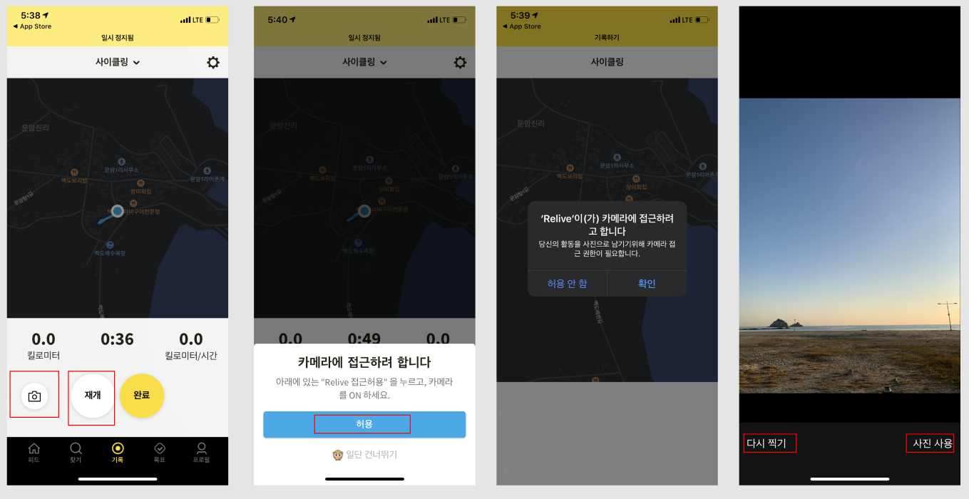 - 시작 버튼을 누르면 일시중지로 버튼이 바뀐다. 다만, 운동을 하다보면 "일시중지"나 "카메라" 버튼이 너무 쉽게 눌릴 수도 있다는 우려가 들었다. 슬라이드 버튼처럼 버튼이 쉽게 눌리지 않게 바꾸면 어떨까?