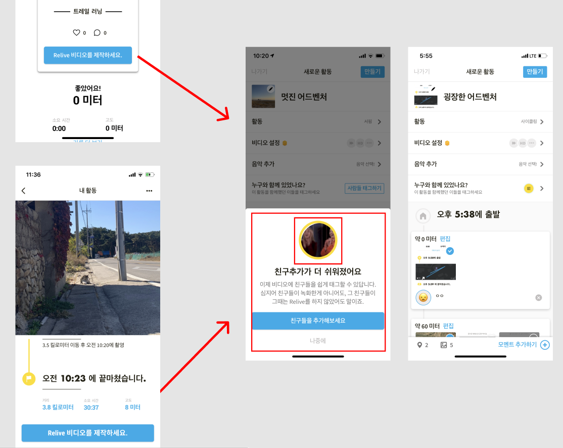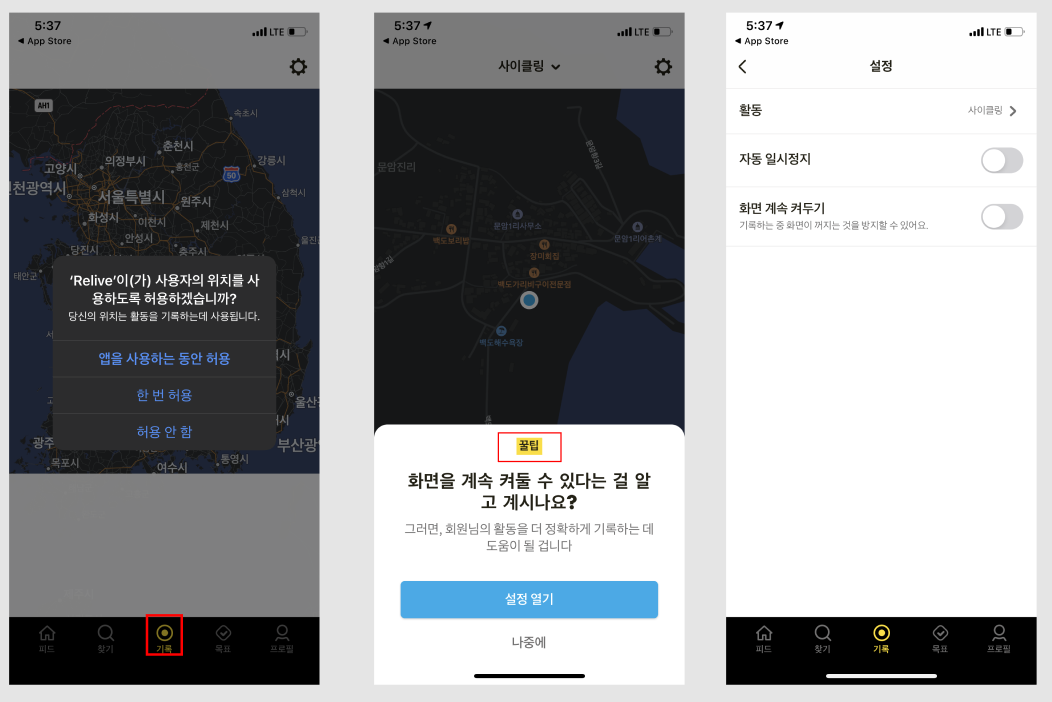 - 또한, "꿀팁"이라며 팝업으로 설정을 요청한다. Relive 입장에서는 기록 기능이 고객에게 가치있는 경험을 주는 데 있어서 중요한데, 이게 왜 유저한테도 중요한지를 설득하고 있다고 생각했다.
