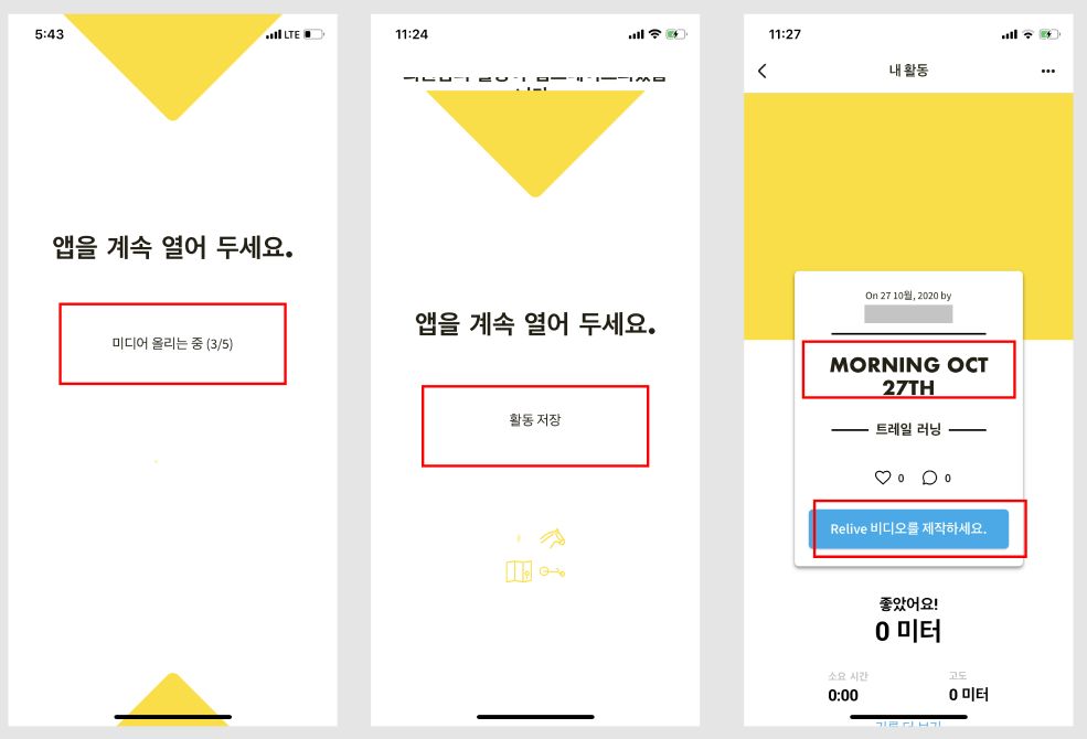 - 완료 버튼을 누르면 앱을 열어두라는 화면이 나온다. 캡처되어서 멈춰있지만, 아웃도어를 상징하는 저 이모티콘이 움직인다. 아무래도 사진과 운동 기록 등을 처리하는 데 오래걸리다 보니, 저렇게 로딩이 길어지는 구간에서는 군데군데 신경을 많이 쓴 게 티가 났다.