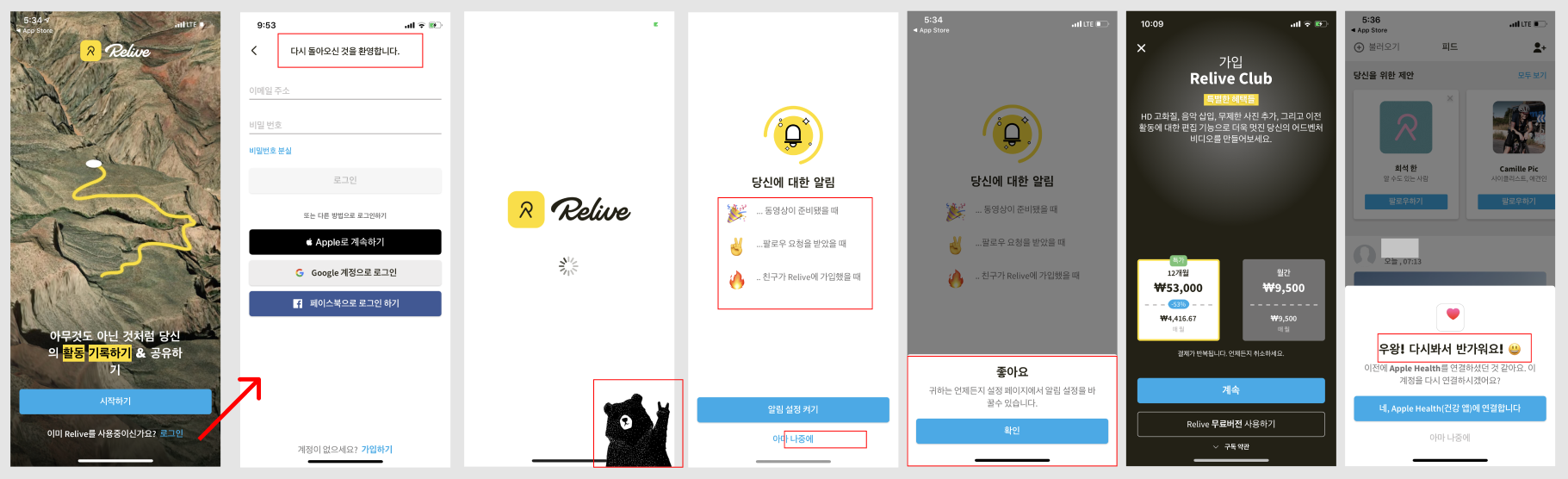- 또한, 간편 로그인이 주인 경우, 보통 이메일 가입은 작은 글씨로 써 있고 한 번 더 들어가서 가입해야 하는데 한 화면에 같이 있어서 편했다. Relive는 간편로그인보다 직접 로그인을 더 선호하는 걸까?